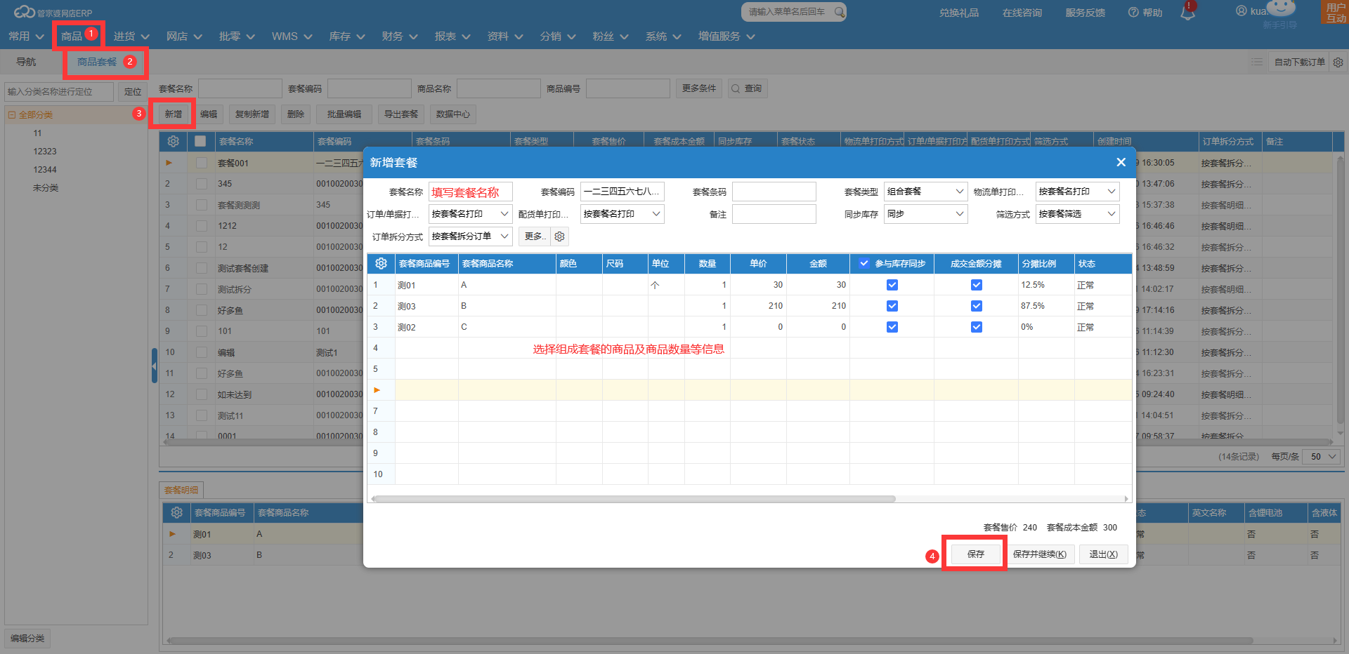 您好,在【商品】-【商品套餐】界面点击【新增】按钮,填写套餐名称等信息后,再选择组成套餐的商品后保存即可。
