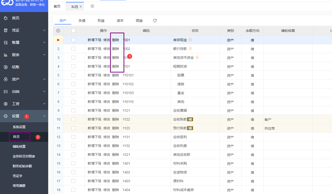 您好,如果您是云财务软件,可以在【设置】-【科目】,去进行修改或者是删除。说明:使用过的科目需要先去删除所有会计凭证之后,再删除科目
